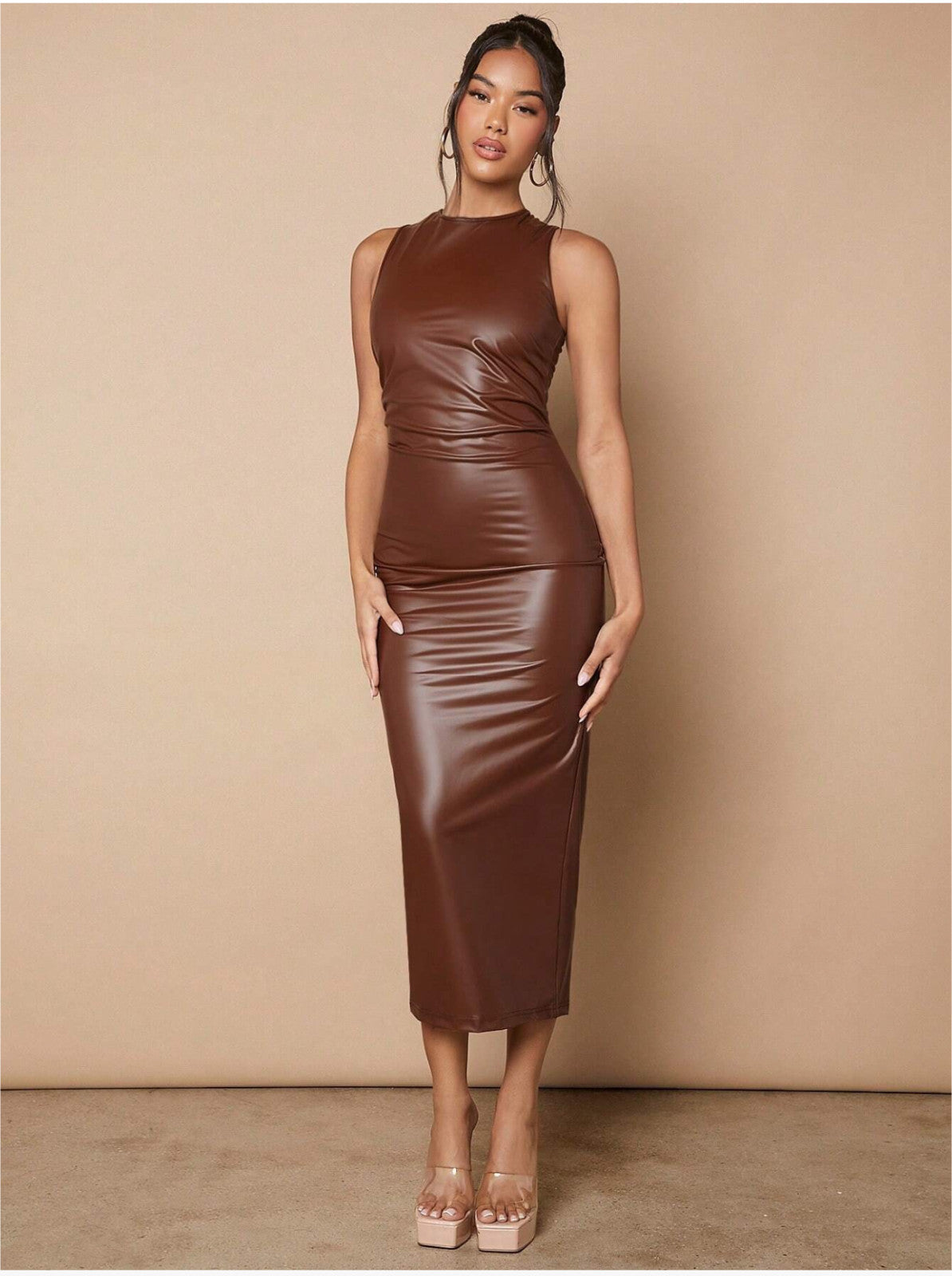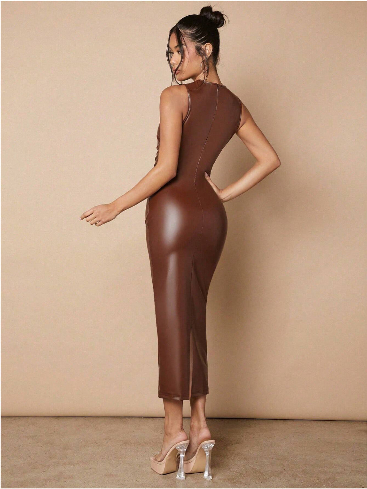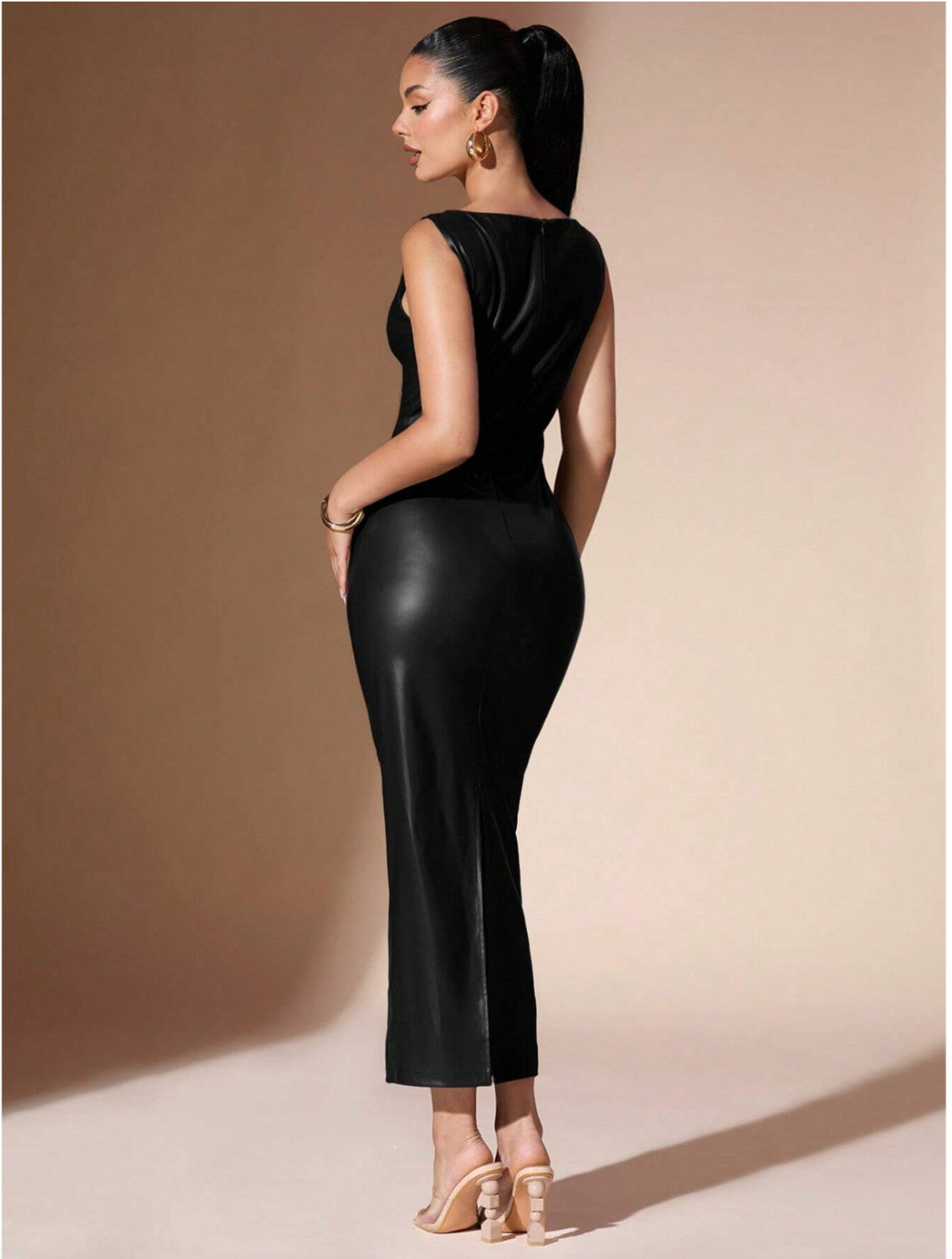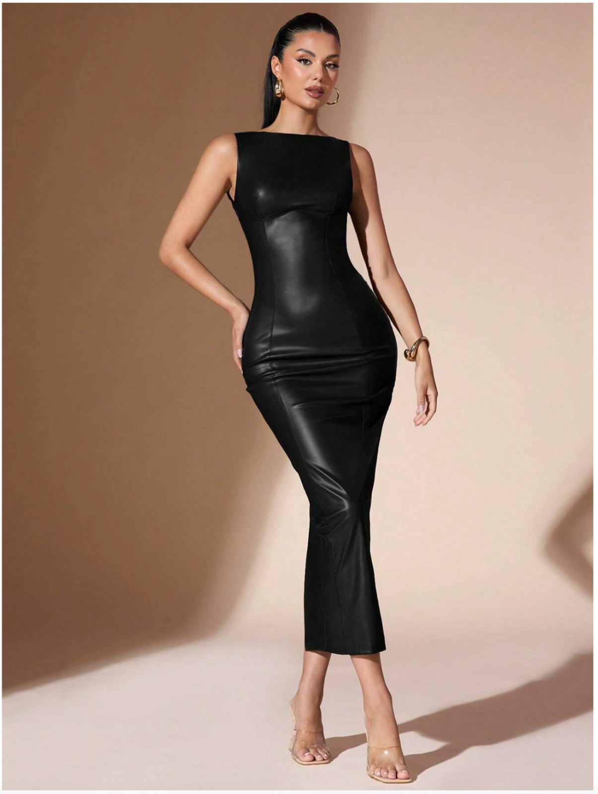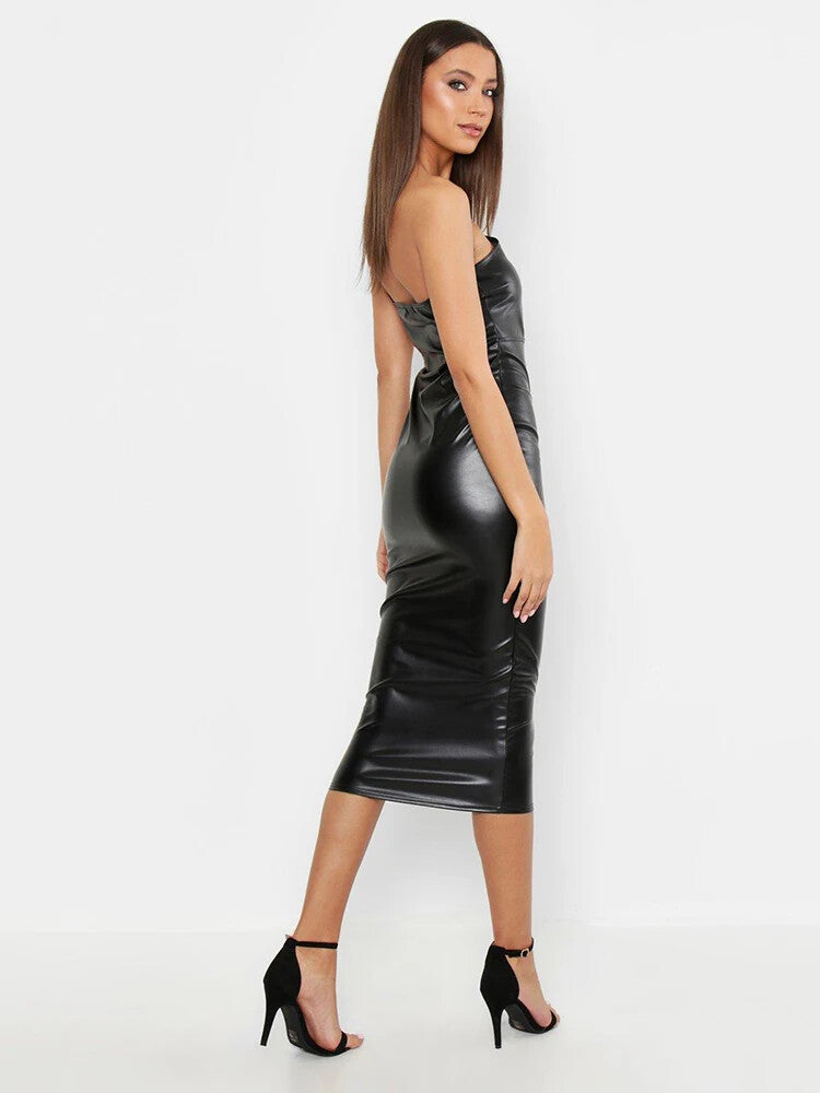 Numi Midi Women's Sleeveless Black Leather Dress – Casual & Party Wear