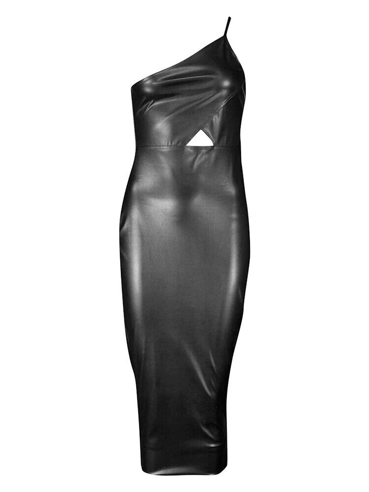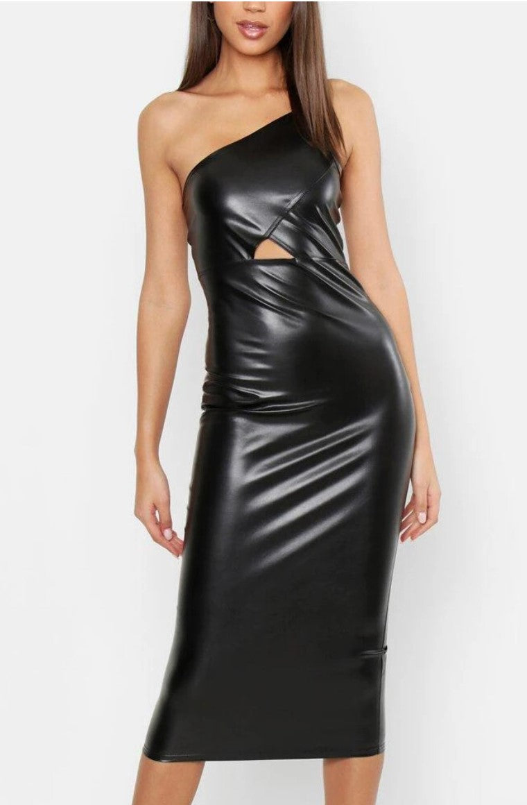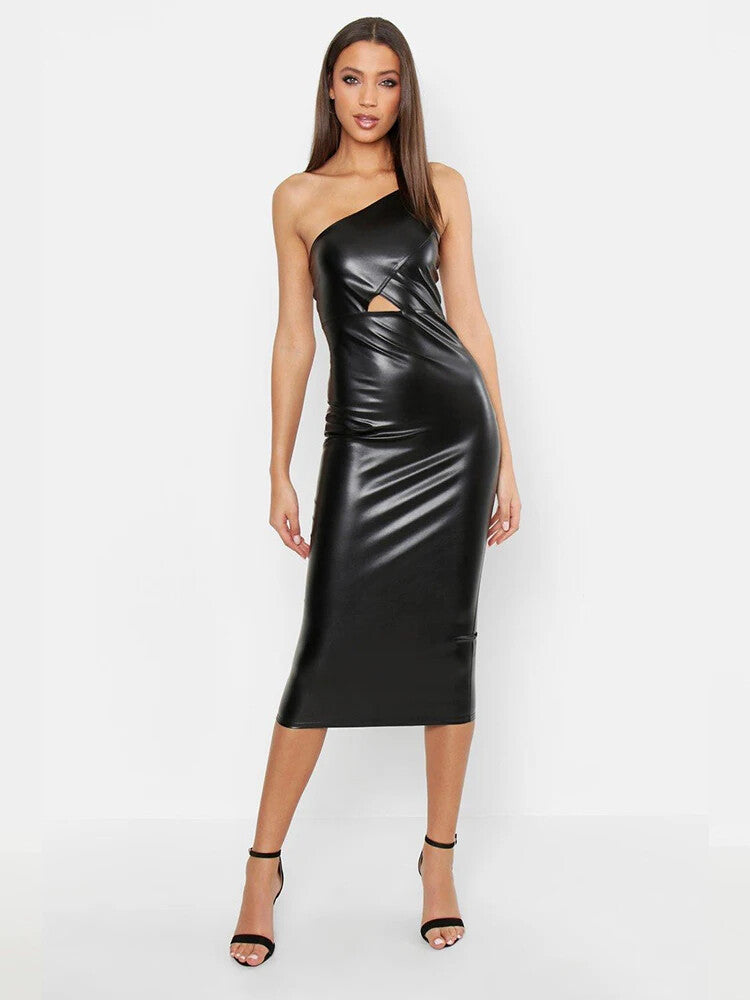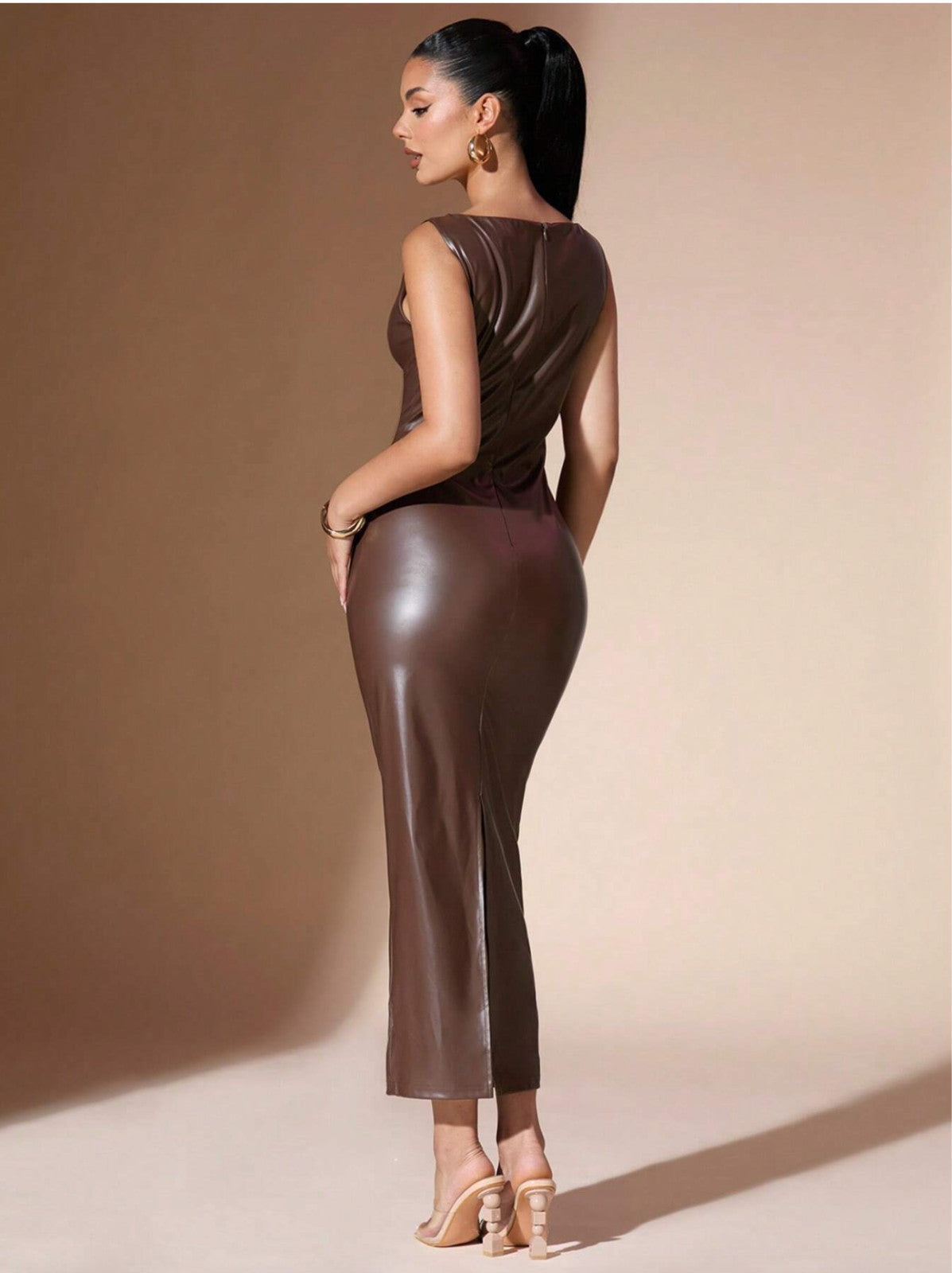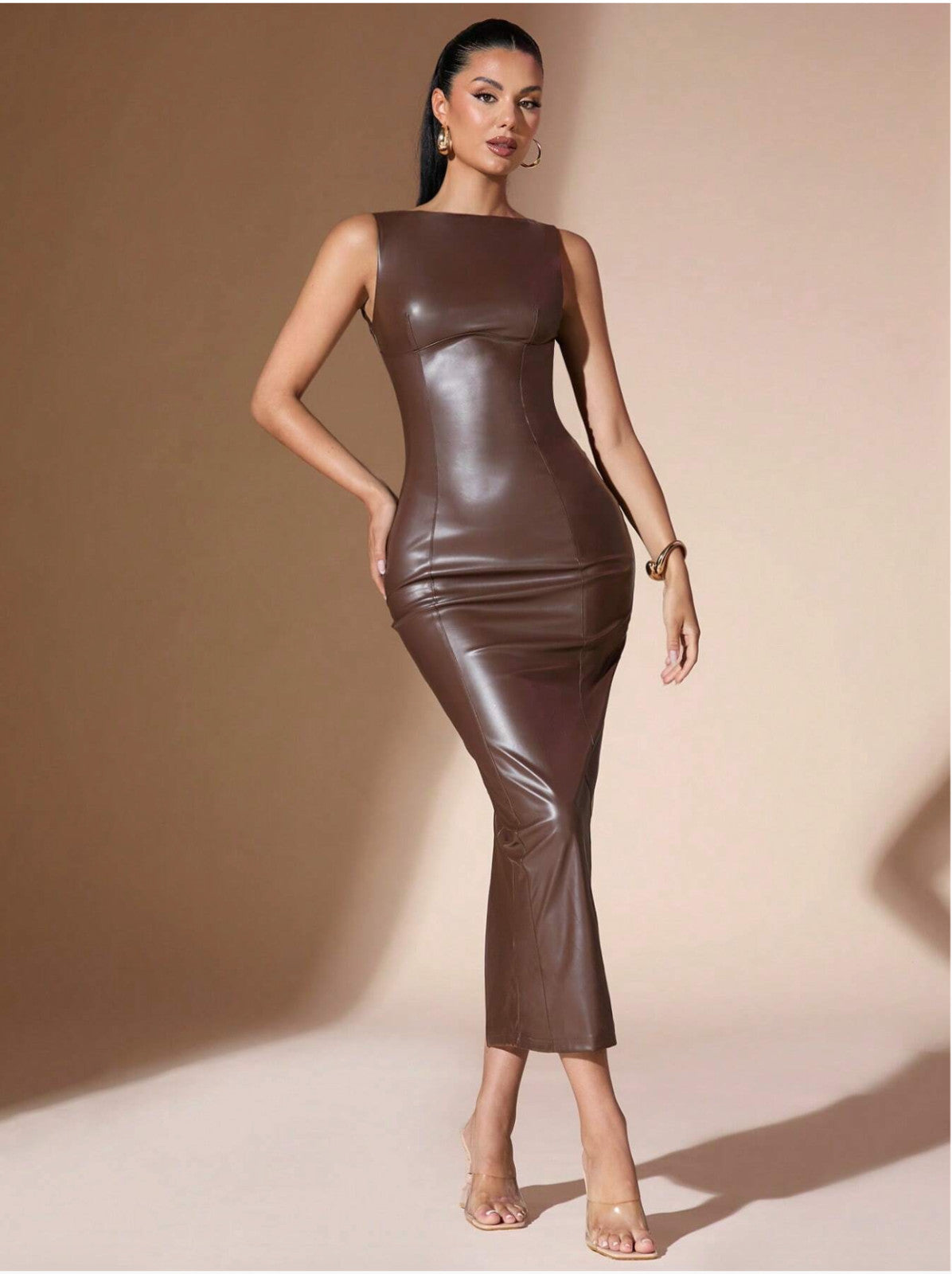 Numi Midi Women's Sleeveless Black Leather Dress – Casual & Party Wear